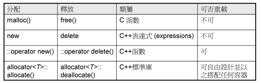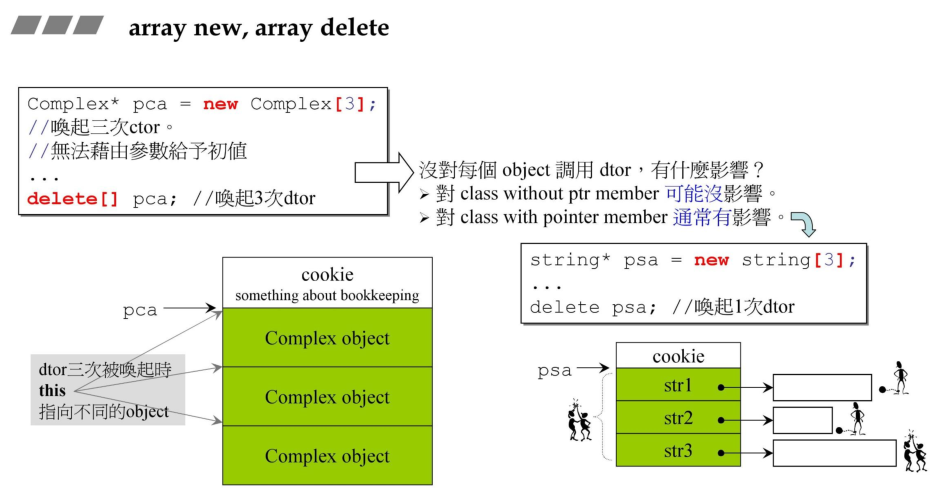 上图是array new的内存分配的逻辑,当使用array new分配一块内存,在这个内存的头部会记录一些cookie数据,包含数组的数量等,然后才是所有的元素的内存区。对于array new分配的内存,需要用array delete来释放。否则会造成内存泄漏