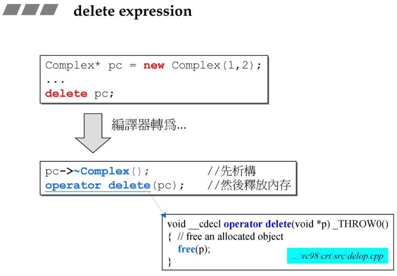 与new表达式对应的delete表达式的内部顺序则相反:首先调用Complex的析构函数,然后再调用operator delete释放内存。