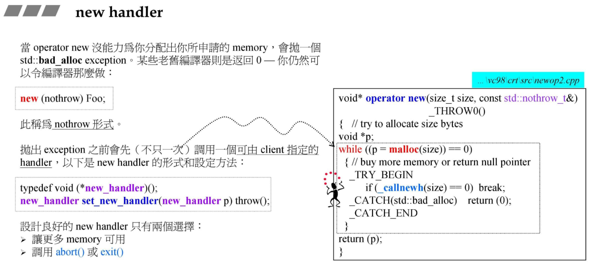 上文提到new表达式实际是调用operator new来分配内存的,operator底层又是调用的malloc来实现的,如下右图所示,在operator new内部会循环调用malloc来分配内存,如果分配失败,则会尝试调用_callnewh来处理,这里的_callnewh是一个new_handler函数,专门用于处理内存分配失败的情况,良好设计的new_handler只有两个选择:释放部分memory用来返回使用,或者调用abort()或exit().