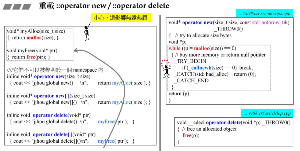 以上是C++应用程序的内存分配的途径,正常情况下,使用new表达式调用的是全局的::operator new函数,前面提到,operator new是函数表达式,是可以重载的,如果我们在类内部重载了operator new的话,那么new这个类的对象的时候就会调用重载的operator new而不是全局的。一下是一个重载的示例: