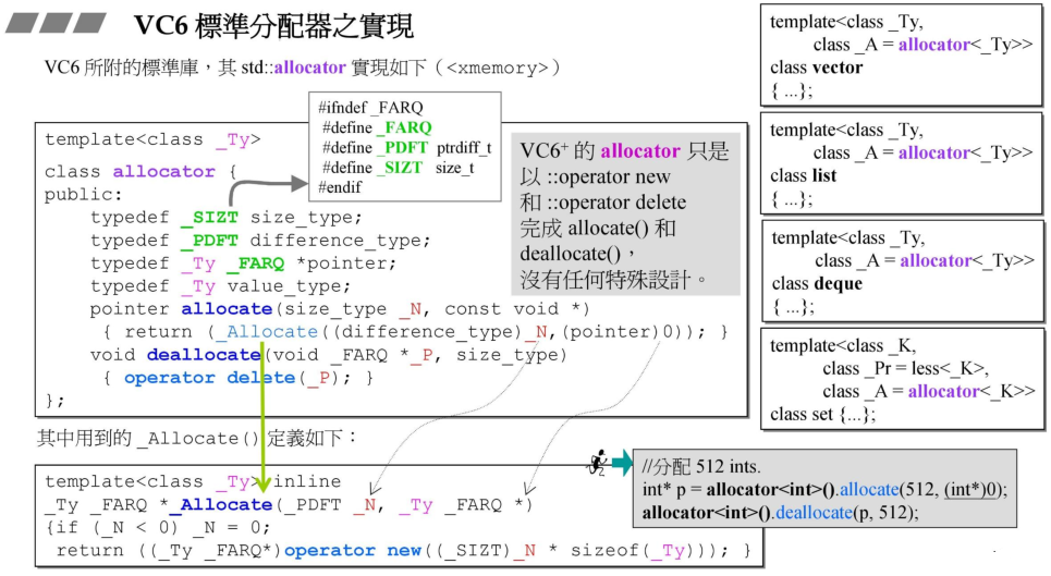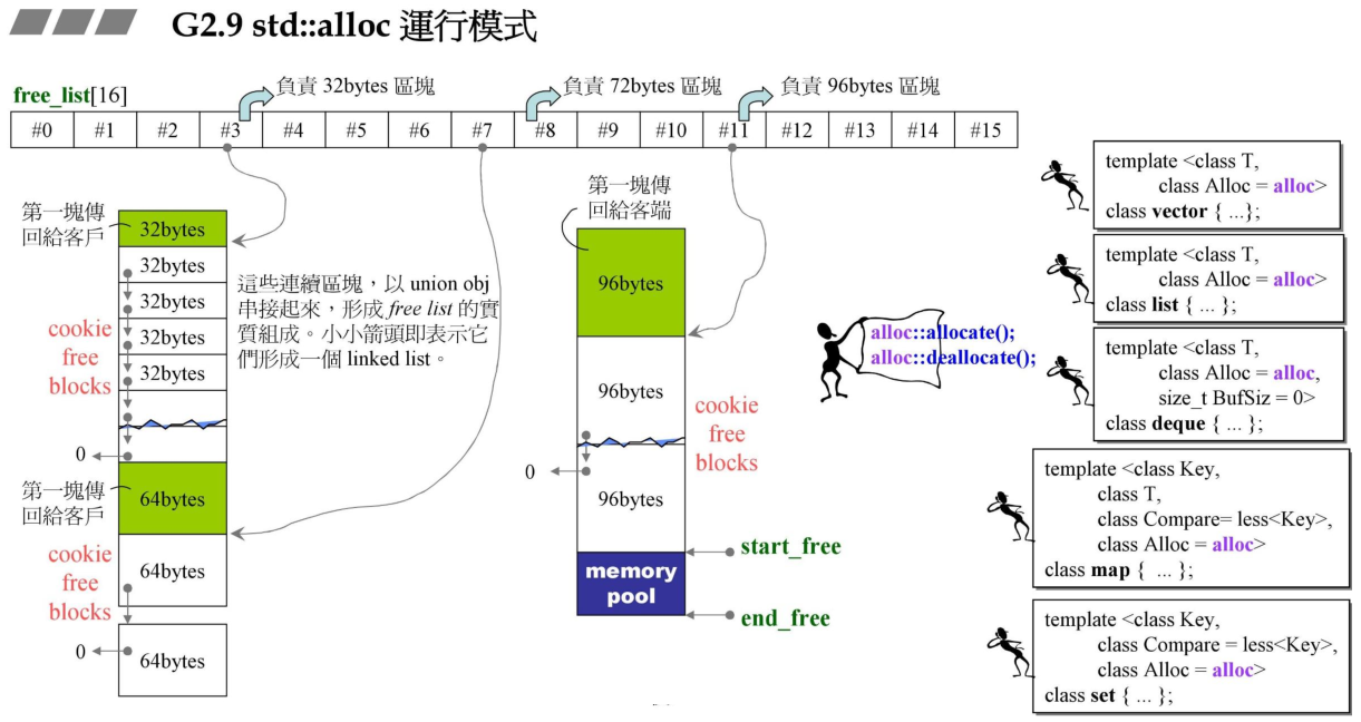 在课程中侯捷老师针对std::alloc有非常精彩的一个讲解,以及源码的剖析,这里简单减少下,之后写一篇专门介绍这个std::alloc的实现。