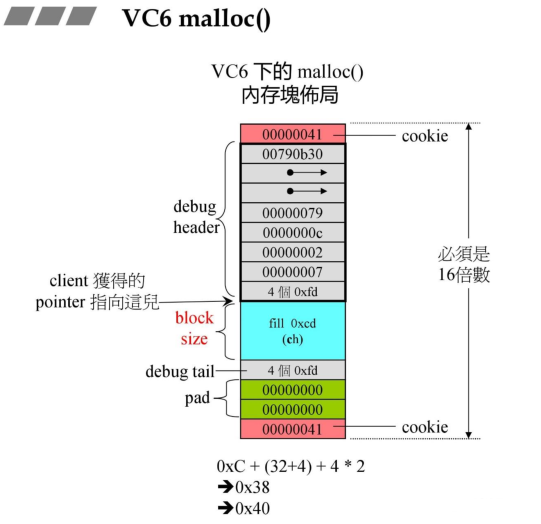 从上图可以看到,使用malloc来分配用户所需要的内存时,在所需内存之外还申请了用于存储cookie,debug和padding信息的内存,cookie一般是记录分配的内存块大小等信息,后续使用free释放的时候就通过cookie的信息来获取大小。debug则是开启debug调试的时候需要的信息,以及一般内存的大小需要是16字节的倍数,因此会有padding用于对齐的内存开销。
