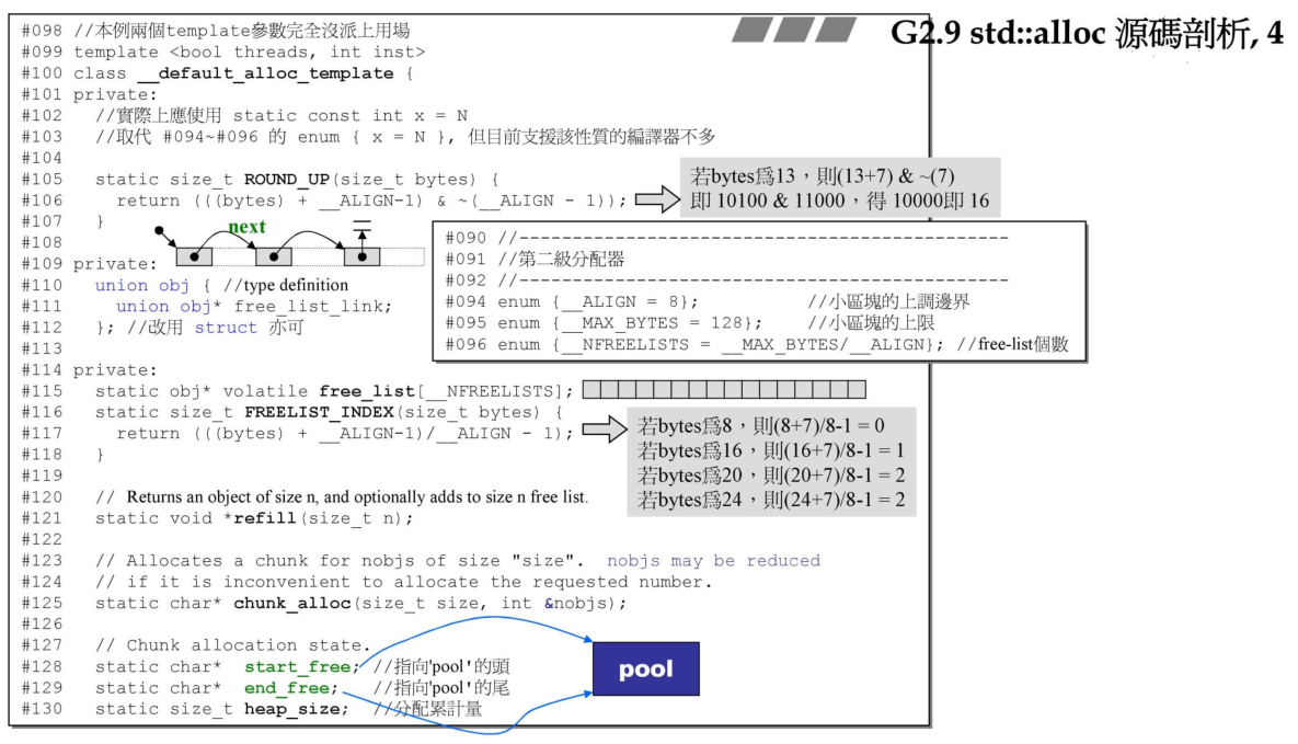 这里首先从第二级分配器的代码开始,该分配器的名字叫做__default_alloc_template,这里定义了ROUND_UP函数,里面将使用的字节数bytes做对齐,对齐到__ALIGN,这里的_ALIGN为8Bytes。类内部定义了union free_list_link,这个就是前述说的内嵌指针。free_list是一条静态数组数据,管理着16条链表,start_free和end_free分别指向该内存池的头和尾部。