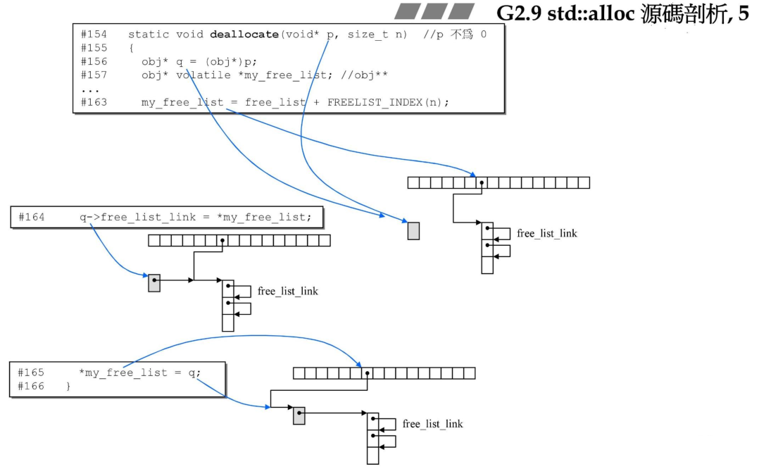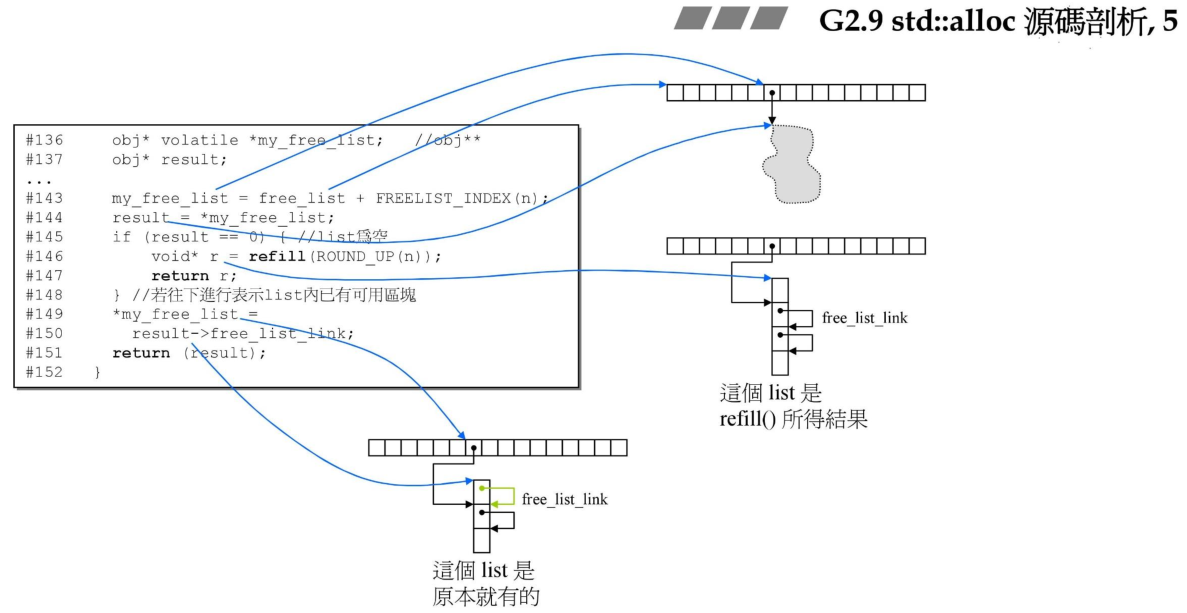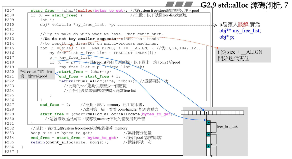 首先看下allocate函数,首先定义的my_free_list指向的是静态链表数组中的任何一个,*my_free_list则是取出free_list某个元素的值,该值指向一条分配内存的链表,所以这里的my_free_list为二级指针。