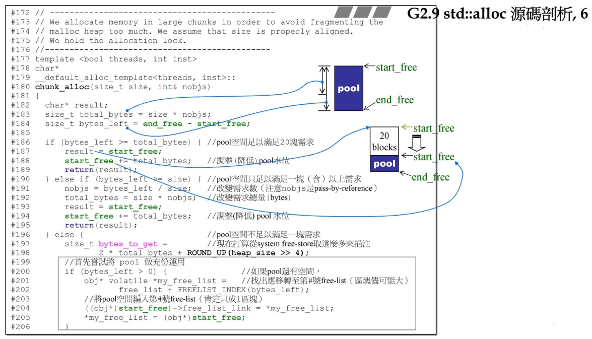 chunk_alloc在最开始计算了一些需要的值,包括需要分配的总的字节数,pool里剩余的字节数,然后判断剩余的内存空间是否能够满足当前的分配的20块的大小,如果满足,则直接分配即可。如果不满足,则看下pool空间是否满足至少分配一块内存块,如果可以,则计算出可以分配多少块(这里nobjs是传引用的,所以可以返回实际分配了多少块)。如果连一块都不能分配了,则需要向系统来申请内存空间,首先将pool剩余的内存物尽其用,分配到对应的链表上。然后调用malloc来分配需要的内存空间大小,如果分配失败,则表示系统可用内存不够,那就需要在已经有的内存上划分出来可用的空间来利用了。
