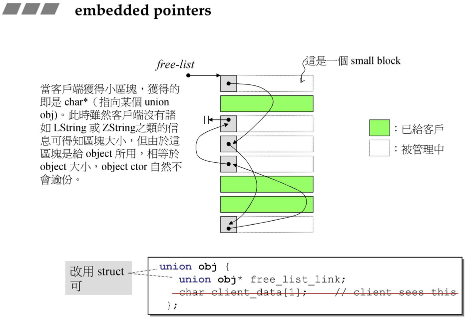 这里每个细分的区块使用的嵌入式指针来节省内存的使用,每个被管理的自由区块头部使用嵌入式指针指向其他的链接的区块,而一旦区块被分配给用户,那么这段内存就可以直接被使用,因此不会造成内存的浪费。这种嵌入式指针的思想在很多的分配器中都有使用。