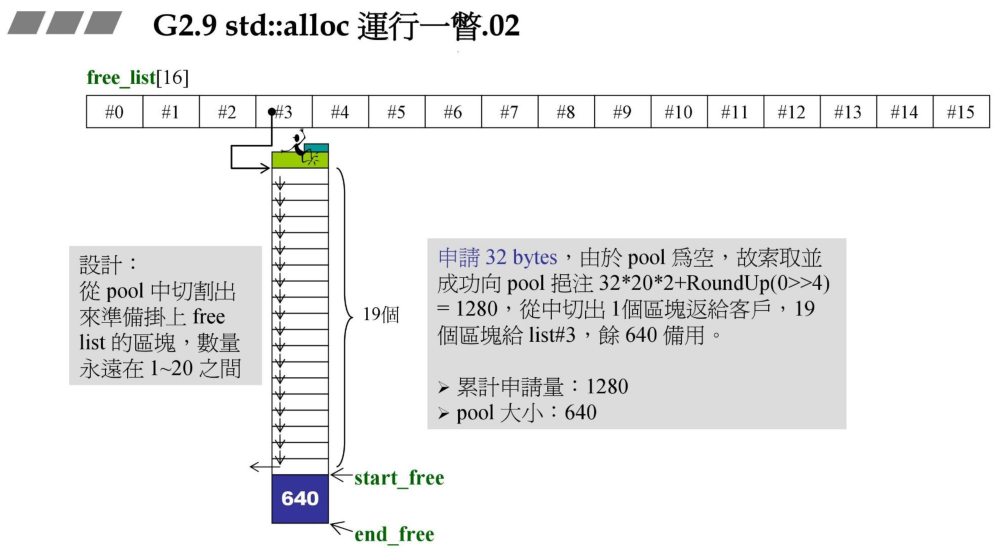 1、在申请内存的时候,如果对应大小的元素列表没有可用的内存(pool)为空,那么便从系统获取对应的区块大小乘上20,并乘上2,再向上RoundUp,分配完成之后,拿出一块给用户,其余19个挂接到对应大小的元素链表上。目前累计申请量1280Bytes,pool大小为640Bytes,通过start_free和end_free两个指针指向空闲的空间。