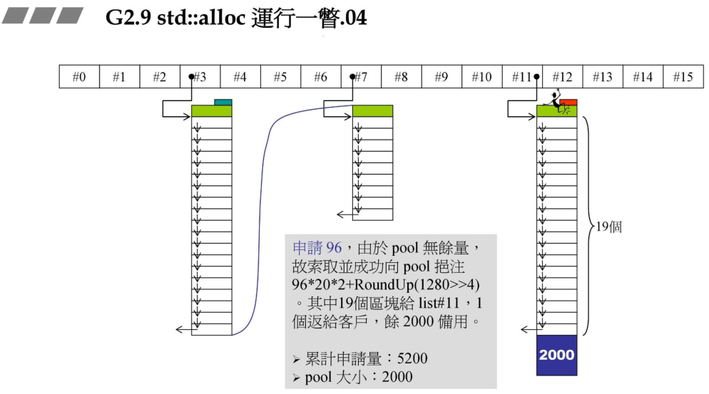 3、继续分配,当用户申请96bytes时,由于96bytes对应的链表为空,而且pool为空,于是想系统申请内存,按照上述的规则,申请的大小为96 * 20 * 2 + roundup(1280 >> 4)。第一块返回给用户,其余的挂接到#11链表,现在累计申请5200 Bytes,pool的大小为2000。