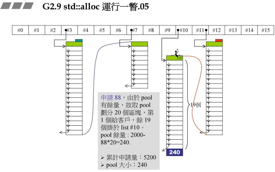 4、当用户申请88Bytes的大小,从pool中分配20个区块,返回一个给用户,其余19个挂接到链表中,pool余量为 2000-88*20 = 240Bytes.