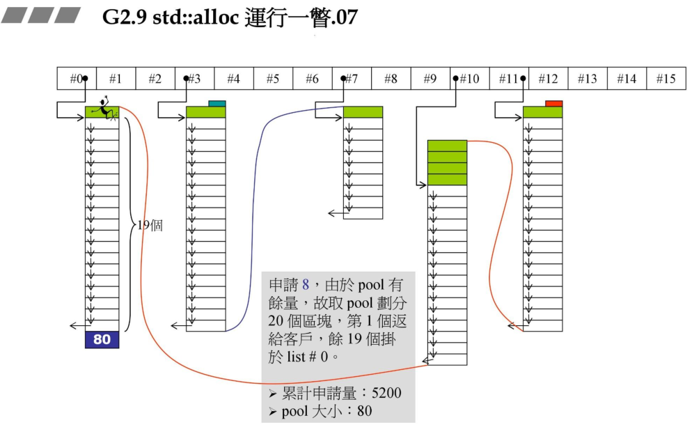 6、申请8bytes的时候,从剩余的pool中分割20个区块,然后返回一个给客户,其余的挂接到#0链表中,pool余量为80。