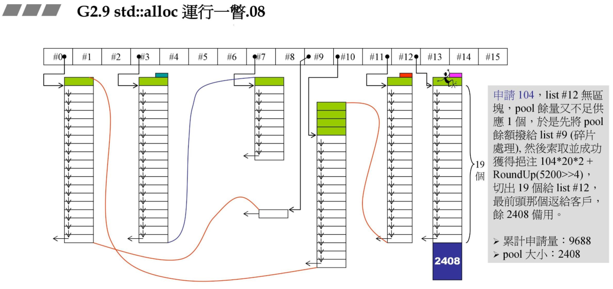 7、当用户申请104bytes时,由于pool的余量都不足分配一个区块,这里的操作是先将pool剩余的内存按照大小计算,挂接到对应的内存大小链表上。计算的链表节点为#9。然后向系统申请内存大小 104 * 20 * 2 + RoundUp.分配第一个给用户,其余的挂接到#12链表。