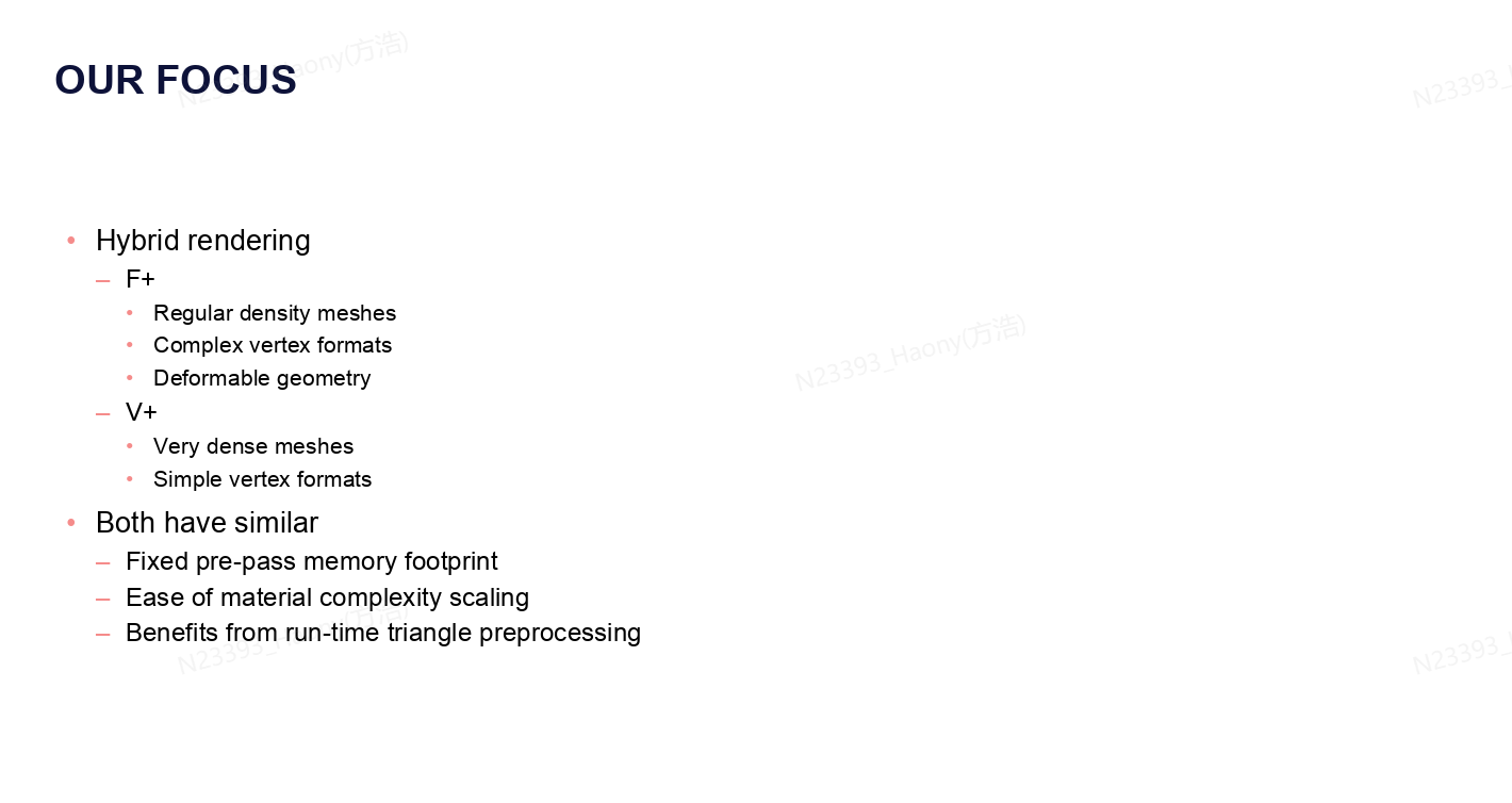 比较了不同的渲染方式的优缺点,最终决定的方式是采用F+和V+的混合渲染管线,对于普通密度的网格,负责的顶点格式以及可形变的几何体,采用F+的管线;而对于高密度的网格以及简单的顶点格式,则采用V+的管线。