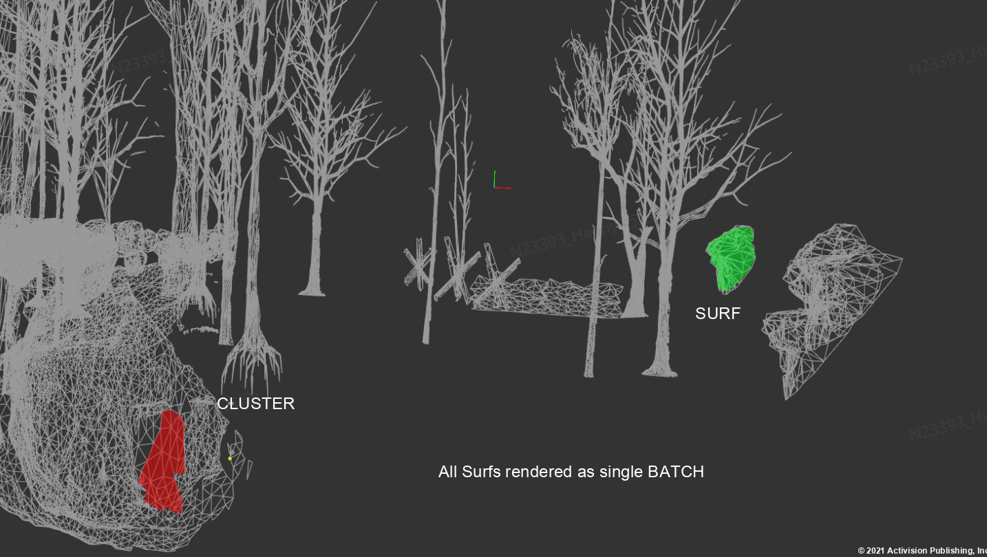这里会首先将场景进行层级的划分,分为BATCH - SURF - CLUSTER三个层级,其中每个Batch对应一个DrawCommand,包括drawIndirect和drawIndexIndirect;一个Batch由若干个Surf组成,每个Surf则是表示每个mesh的一部分,mesh按照不可合并的material划分为若干个Surf,每个surf内的三角形的材质是一致的;每个Surf又由若干个Cluster组成,每个cluster则是一个64个三角形的strip。