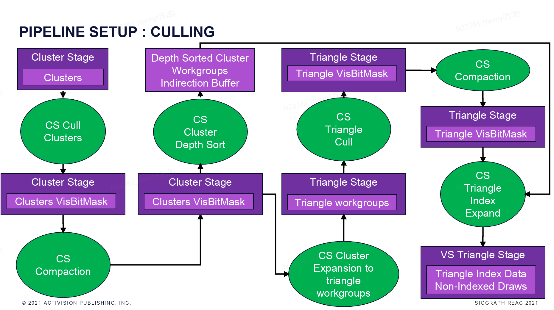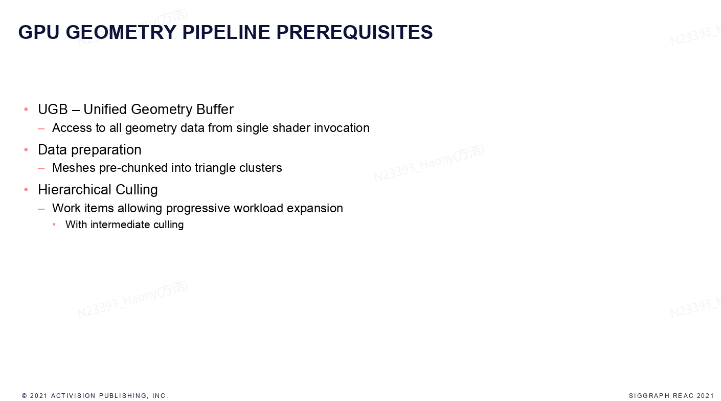 这篇文章是动视暴雪在2021年的分享,主要介绍引擎处理场景中大量复杂的geometry的渲染,提出了一套geometry processing pipeline。