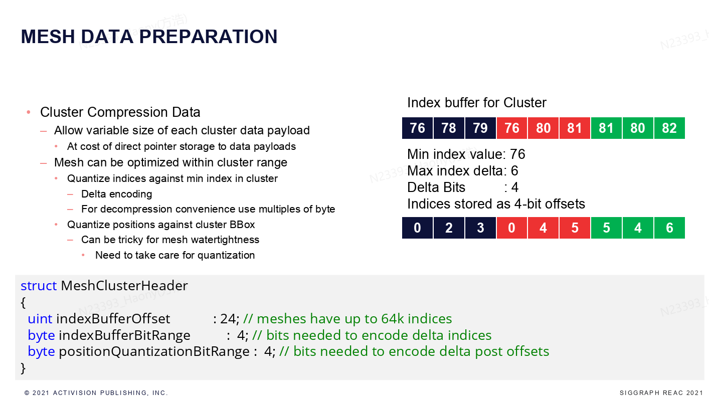 同样,这里需要将原始的网格切分为一个个cluster,每个cluster是一个64 triangle strip,具体的划分会考虑index range, position locality和normal locality等因素,同时还会生成culling需要的数据,包括bounding box和normal cone等。