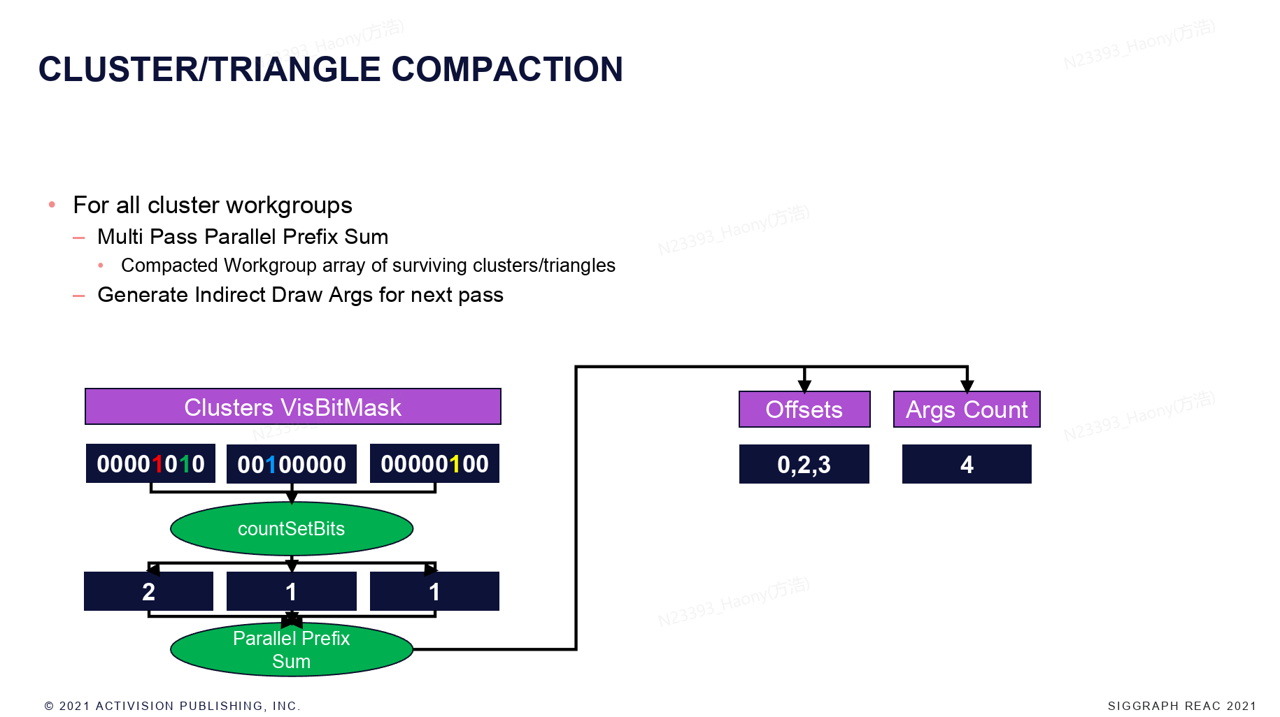 对于所有的cluster的work group,首先每个group统计visBitMask中的bit数量(可见的cluster数量),然后进行并行的prefix sum,可以获取到每个cluster的offset,并且得到所有的可见的cluster的数量。