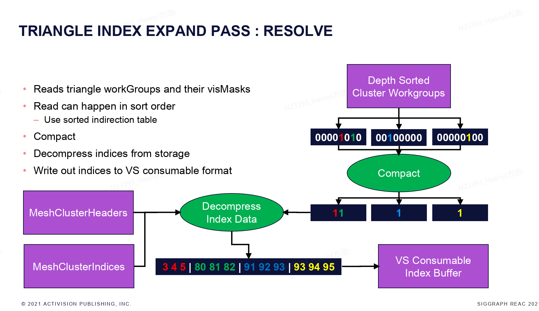 跟cluster的流程类似,获取每个cluster的triangle visBitMask之后,将可见的triangle信息统计出来,因为这里存储的是triangle的index,而实际需要绘制的是vertex的index,因此这里需要Decompress index data,将其compact到最终VS需要的index buffer上。