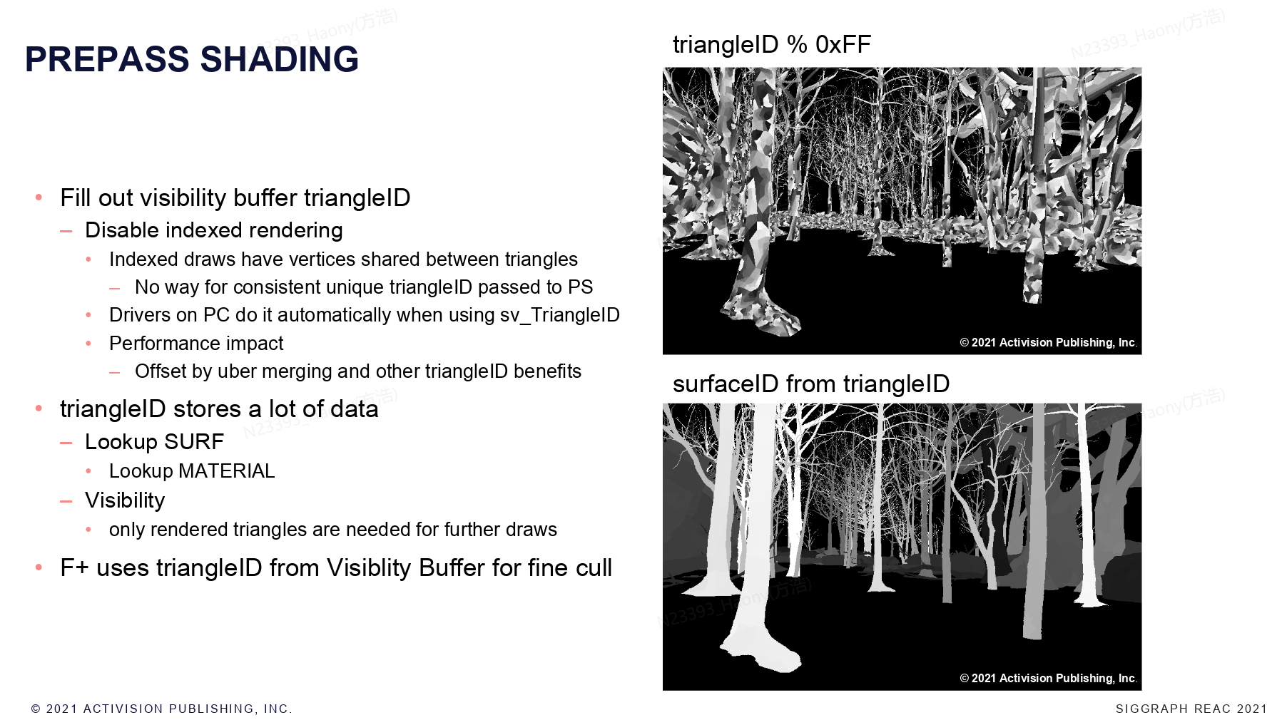 在pre-pass阶段,一个重要的任务是将triangleID写入到VisBuffer中,在index drawcall中,多个三角形会共享顶点,无法在PS中获取一致且唯一的triangleId,所以这里针对于使用VisBuffer的地方禁用了indexing。有了triangleId,实际上就可以做很多的事情,比如查找surf,material等,以及逐像素的culling。